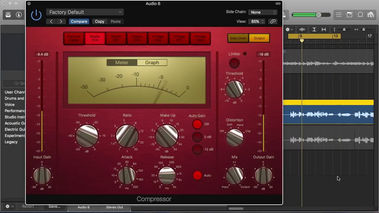 This beautiful compressor is part of Logic’s Compressor plugin. It emulates the famed UREI 1176 Rev H “Silverface” compressor.