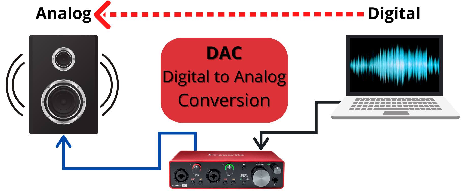 It then reverses the process and converts the digitized audio back to an analog electrical signal, before sending it to an output line where you can hear the sound using studio speakers or a pair of headphones.